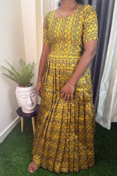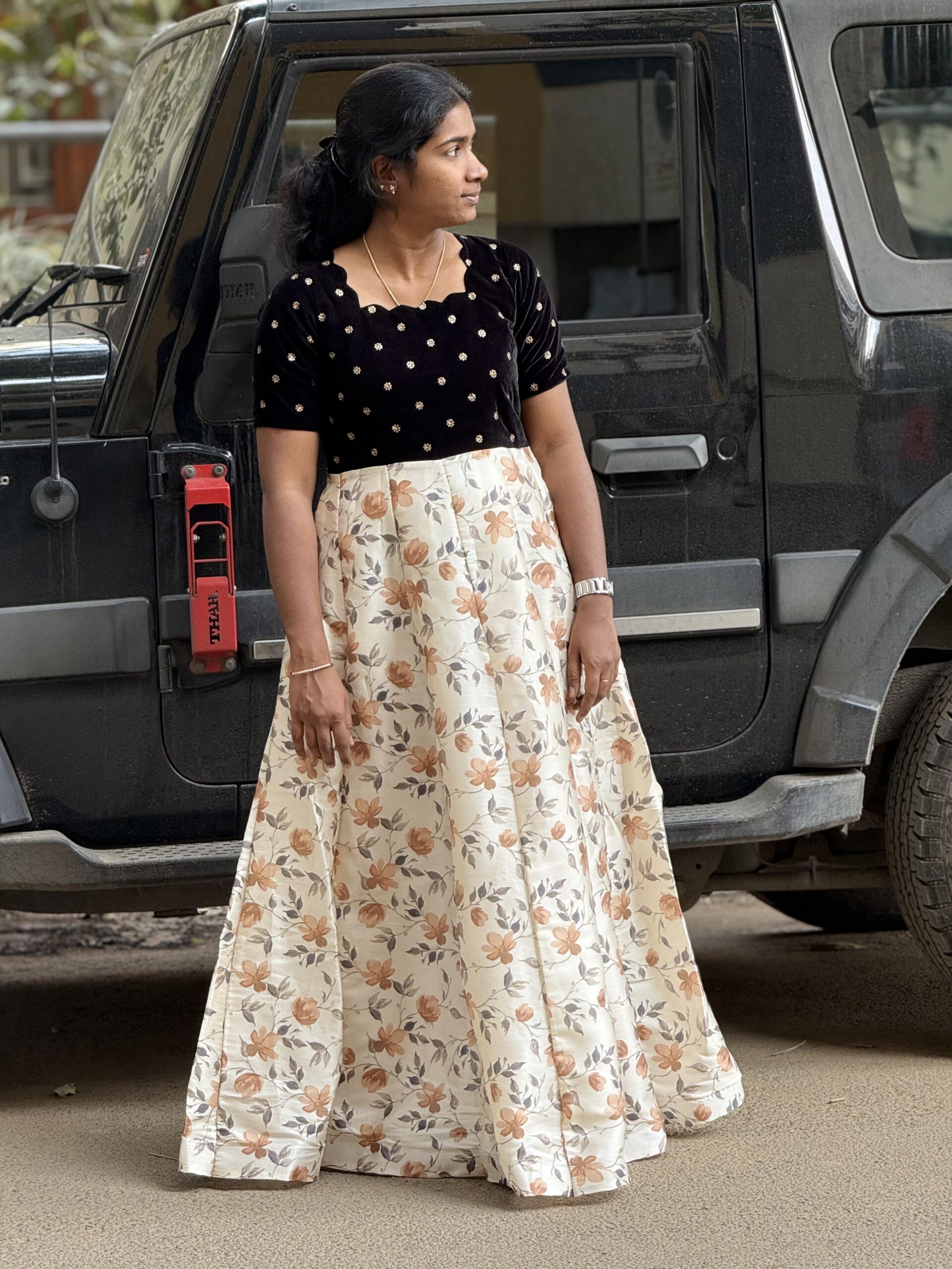 A stylish fusion gown featuring a rich velvet bodice paired with a soft floral-printed flared skirt for an elegant contrast. Perfect for festive occasions, it blends traditional charm with modern sophistication for a graceful, standout look.