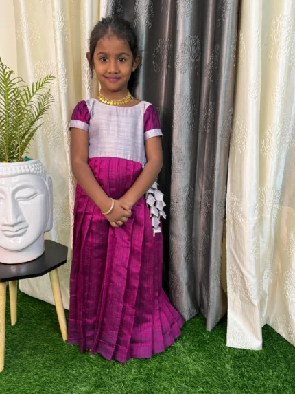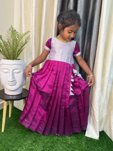 Deep purple set with Kurti and dupatta. It’s a college or work wear for every wardrobe. It comes with notch neckand scallop sleeves. Dupatta has traditional Zari woven designs, giving it a rich Banaras look.