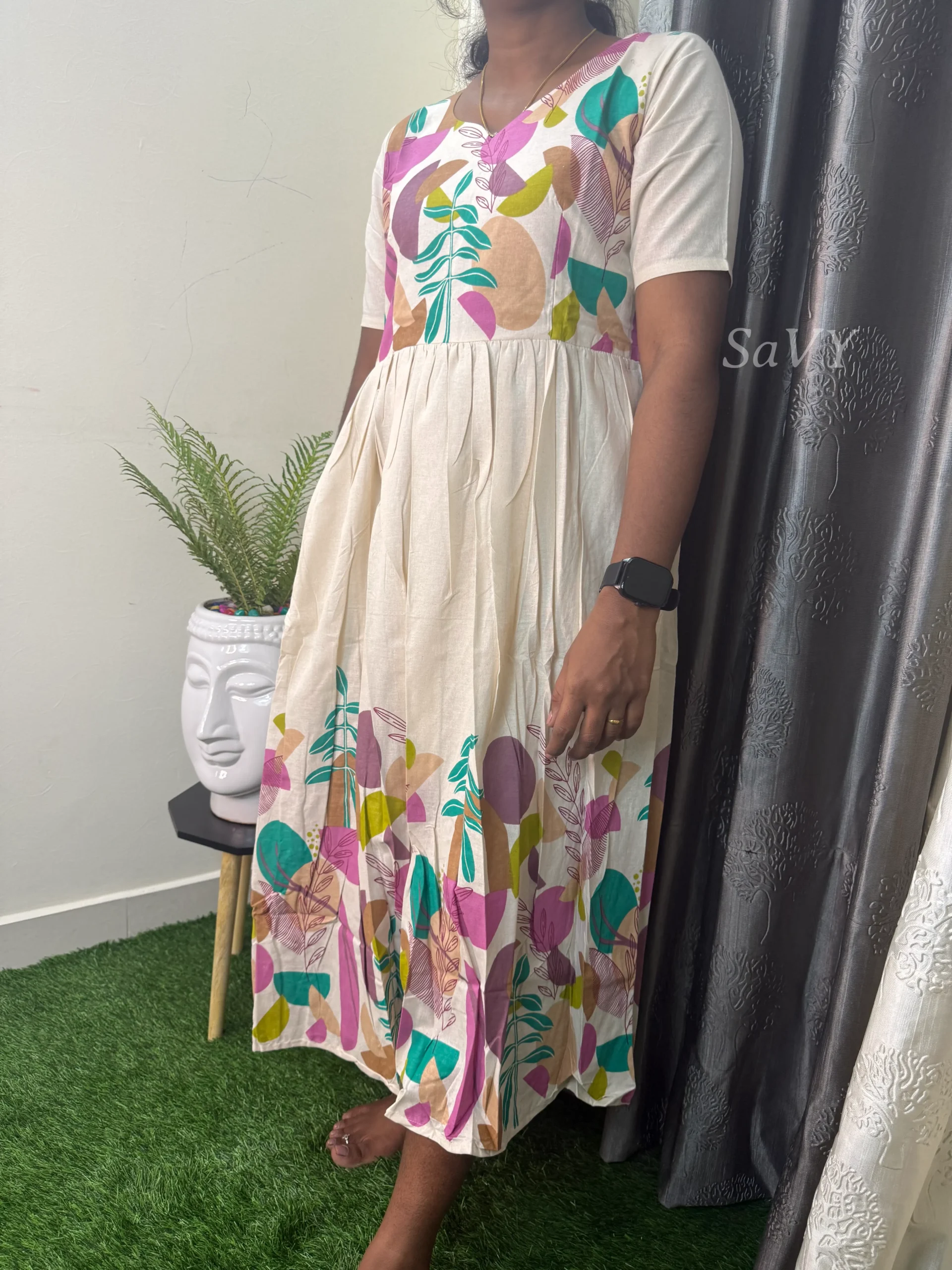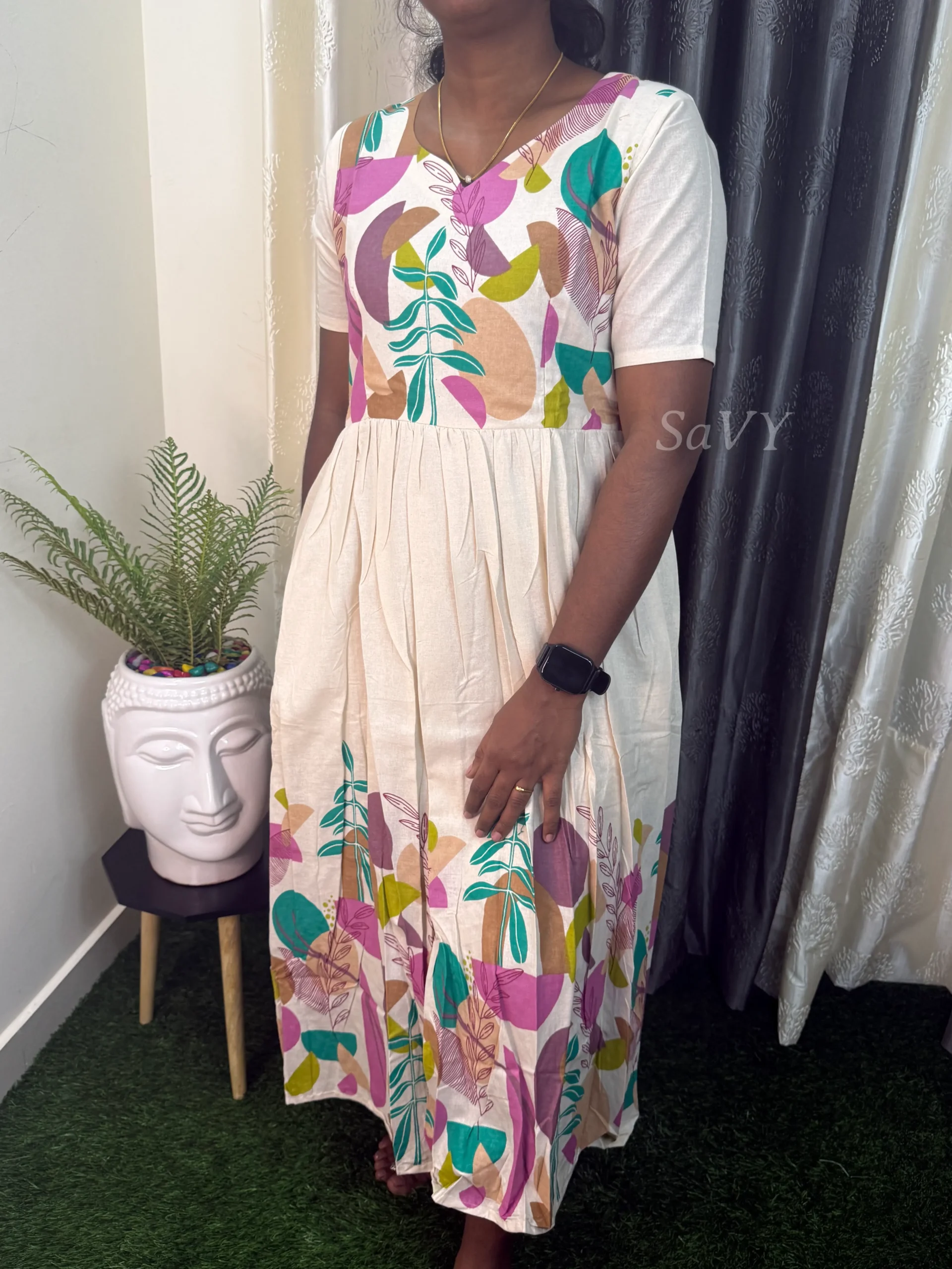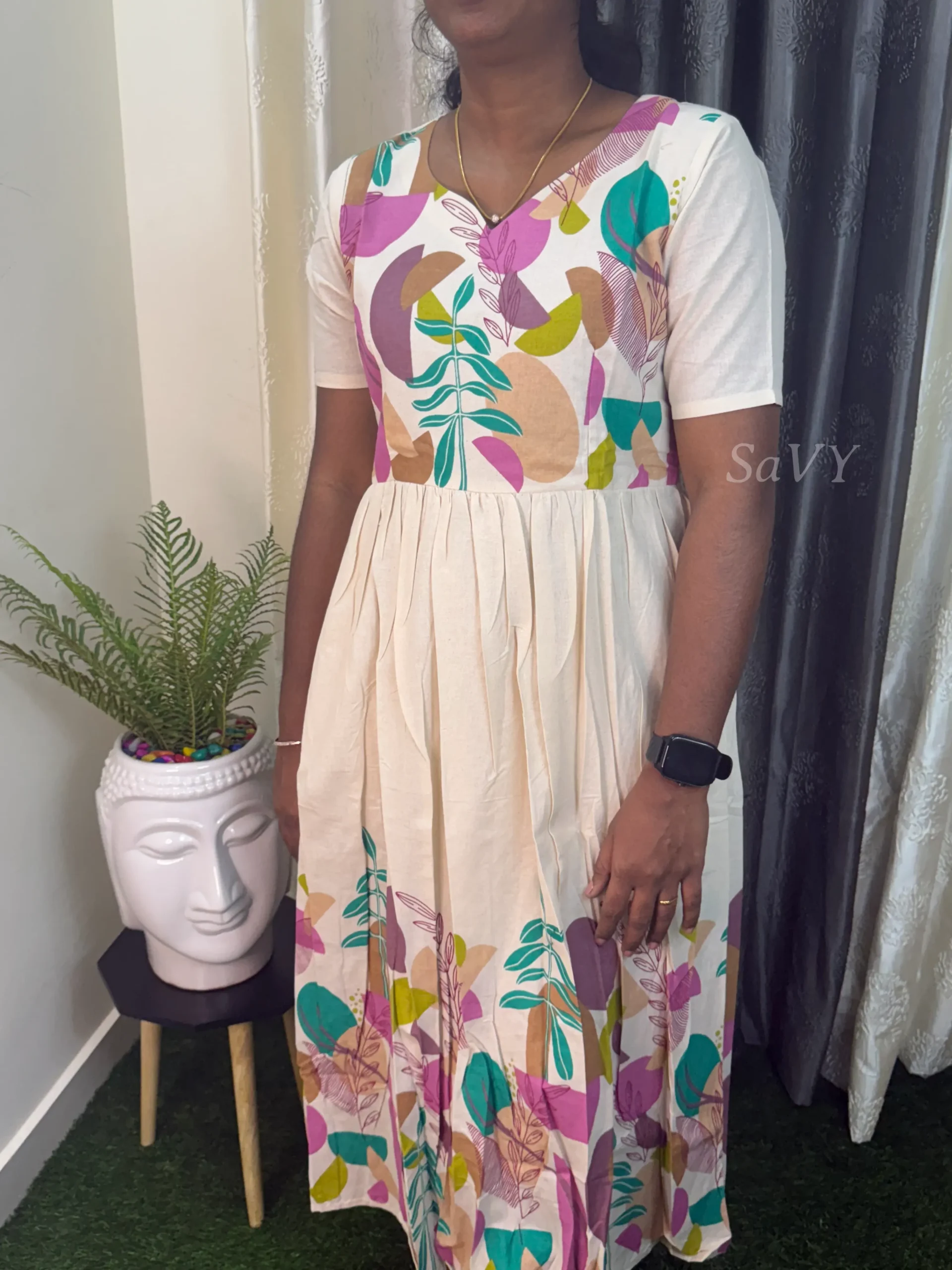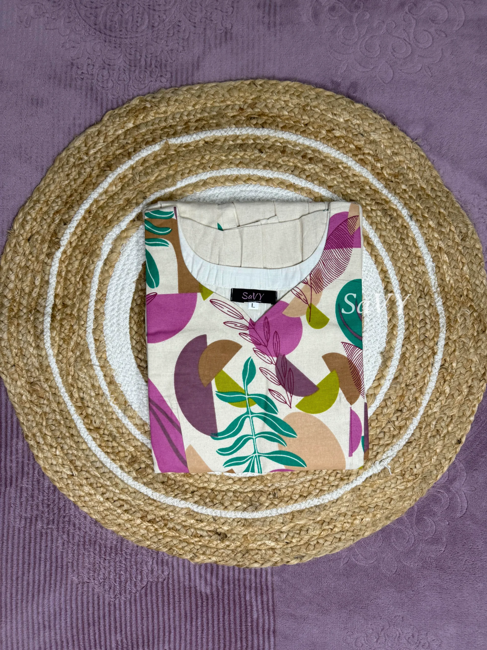 This fabric glows in a Cream Base Multicolor Abstract Print. It’s a casual wear for every wardrobe. It comes Curved V-Neck, basic Sleeves and Single side pocket.