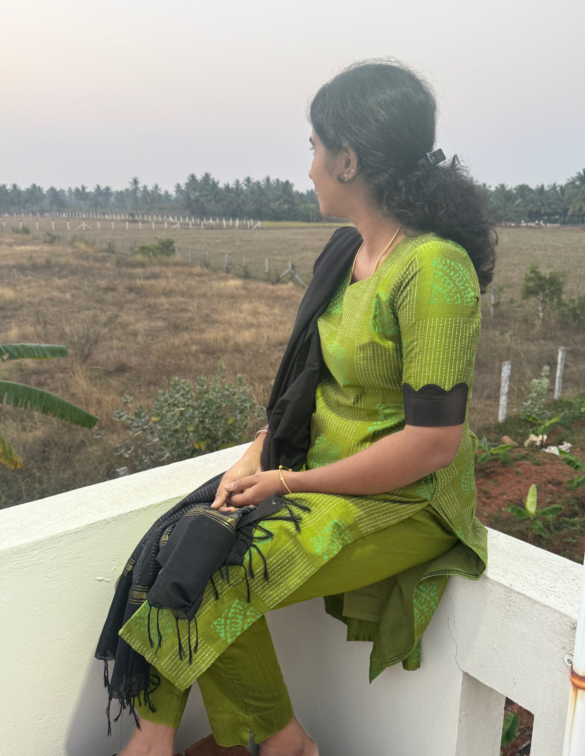 Printed cotton kurta set in olive green with subtle mint-green motifs and black contrast detailing. Paired with matching pants and a lightweight black cotton dupatta. Comfortable, breathable, and ideal for everyday or office wear with scallop sleeve design.