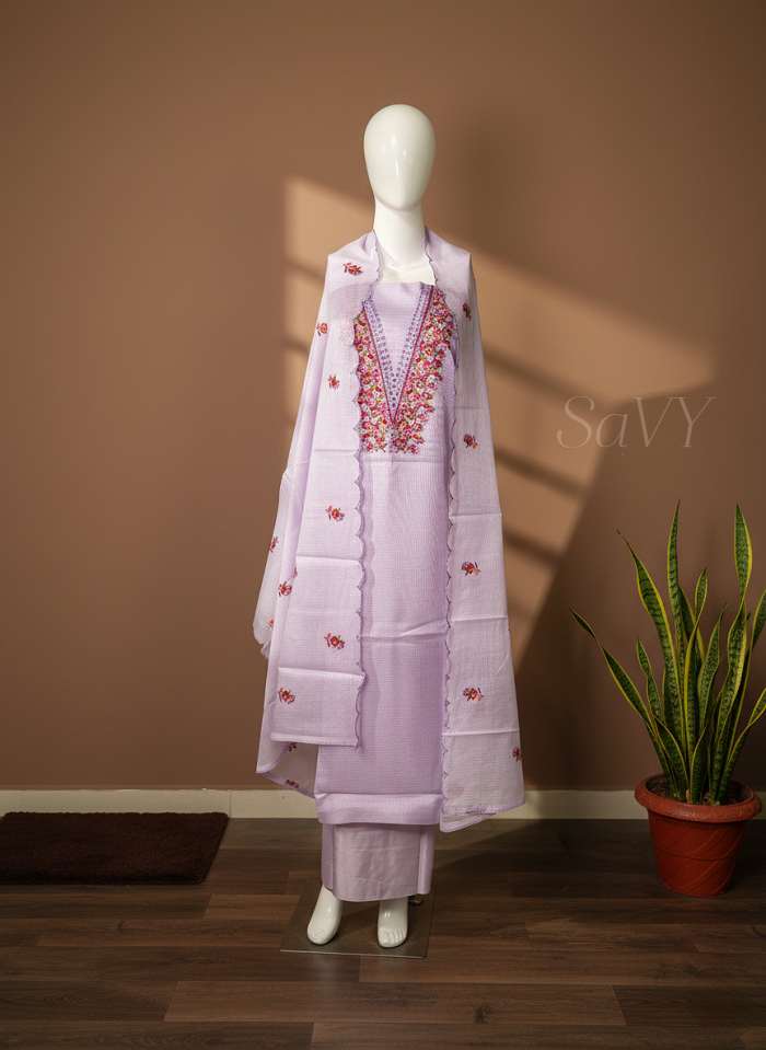 A lightweight Kota Doria unstitched suit set in a soft lavender shade. The kurta features a detailed floral embroidered neckline, paired with a matching Kota dupatta finished with scalloped edges and scattered floral buttas. Comes with a plain cotton bottom for a clean, coordinated look. Ideal for everyday wear, office, or light occasions.